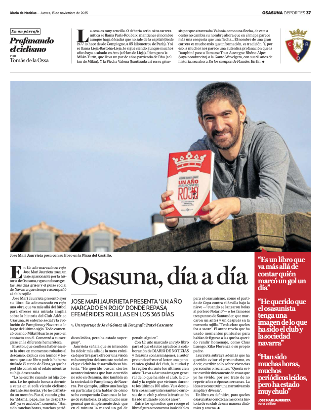Jaurrieta nos cuenta en su libro una historia de Osasuna para cada día, pero la suma de todas ellas muestra la comunidad, la historia, la identidad común y la realidad social que vertebra Osasuna, cuyos verdaderos protagonistas son las miles de personas que comparten su pasión.